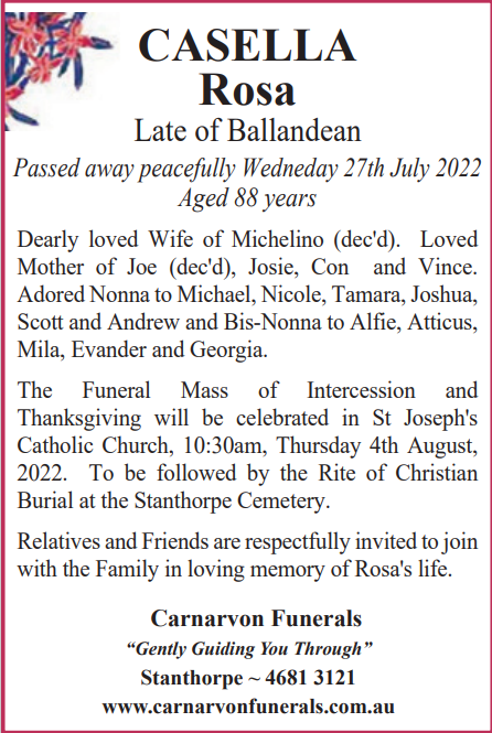 Casella, Rosa Carnarvon Funeral Services Our sincere and deepest condolences to the Casella Family. Required Field Message FromMessage To:Click below to send your messages to the correct Family.—Abbott, Terence George "Terry"Achille, RoseALBERTON ElizabethAllan, Dennis WilliamAllum, Shirlie JeanANDERSON Wyndham Macdonald (Mac)Appleton, Renee JaneArden, Stephanie AnnAtkinson, Alwine IsobelAuliff, Ralph PeterBACCHETTI BrunaBAILEY Peter JohnBainbridge, Ian FrankBaker, Barry WalterBallinger, JuneBamberry, Doris MerleBarber, Julie MaragaretBarbierato, DarioBARKER Ronald WilliamBarker, Richard James 'Dick'Barlow, Stanley LewisBarnett, Phyllis MargaretBarry, Graham Thomas JosephBarry, Robert JohnBartlett, Allen GeorgeBaseggio, MariaBates, Henry ErwinBathersby, Michael ConquestBathersby, Muriel AileenBatki, VinceBATTEN Micheal StephenBATTERHAM KEVIN BRUCE (SKIPPY)Batterham Trevor JohnBatterham, Donald ThomasBatterham, Gail RuthBatterham, Maurice LyalBatterham, Noel Bradman "Blue"BAUSCH Joan ShirleyBeahan, KevinBEAHAN, Patrick GerardBeard, Joan IsobelBeattie, George HenryBeckett, Douglas JohnBeddow, RitaBELFORD KeithBELL Zonya Wendee JoyBell, Colin DavidBell, Jewell Cora JoanBELLERI Rosa - BELLERI JimBENNETT Victor FredrickBERLESE ErmenegildoBerlese, ErnestaBERNOTH GlennBertinazzi, Lorenzo BrunoBertram, Doris JeanBIDDLE Maxwell Eric (Max)Binkins, Michael PaulBlack, Brian JohnBlank, Sydney Joseph (Syd)Blue ChristmasBlue Christmas 2024Blundell, Peter CharlesBlundell, Peter WarrenBolton, Janice EvelynBolton, Leslie WilliamBONETTO Adelina (Linda) FrassettoBonner, Peter RolandBonner, Therese 'Tere'Bonoguore, Michael JohnBOOTH Grahame SidneyBosel, Madeline RubyBoston, Shirley AnnBOTT Peter JohnBott, Ruth JoyceBoucher, Michael NeilBougoure, ElaineBOUGOURE, EuniceBourne, Joan Alix FitzroyBourzali, Zineb Agnes (Zina)Boyce, Edward Peter (Ted)Boyce, Joseph John "Joe"BOYLE Vincent Thomas (Pat)Bradford, Patricia Faye 'Pat'BRADY Brian JohnBRADY Patrick Arthur (Stubby)Brandrett, AnthonyBRISOTTO Dino GiorgioBrisotto, Gianni Vincenzo (John)Brisotto, Melanie NicoleBrown, Dawn LatriciaBrown, June MaryBrown, Ronald "Joe"Brown, Veda JoyceBROWNE William JosephBrowne, Mary MillicentBurger, Louisa Angenita JohannaBURGES MaureenBURMESTER JeanburnsBurns, Margaret MaryBurns, Thomas Charles "Tom"BURTON, Charles Francis Boysen "Boyce"Burton, David CharlesBurton, Roslyn Christine (Roz)Buscher, Jochen (Joe)Bush, Kenneth CharlesButler, Mavis BerylButler, Olive HelenButler, Trevor FrancisBykowski, Marilyn AnnCALA SebastianoCALOTTI Maria AntoniaCannavo, CarmeloCantarella, LugiaCantwell, Daniel JamesCANU Giuseppe Antonio SebastianoCaporali, Luigia Josephine (Josie)Capuzzo, ImmacolatoCardillo, CesareCarnell, Elizabeth MarjorieCarniel, AngelinaCarniel, Eugenio 'Eugene'Carson, Paul AlanCarter, Sydney BernardCARUSO CarmeloCaruso, GraziaCaruso, RossCasella, RosaCaslick, Stephen DavidCattarin, Gabriel ChristianCaulley, Ann GwendolenCave, Marjorie LillianChaplin, Ian LenardChapman, IreneChapman, Maxwell RaymondCharlwood, Anthony "Tony"CHERRY James LyleCicvarova, MariaCividini, Drago (Karl)CLARK Francis Graham JohnClark, Dolores (Shirley)CLARKE Barrymore Francis (Barry)Clarke, Mary HendersonCobon, Helen MayCoco, Salvatore 'Sam'COGHLAN Gary VerdumCoghlan, Noel William MichaelCole, Carolyn JanelleCOLLEY CarmelCollins, Kathleen DigbyCollins, Lisa GayeCollins, Lorna GwenColyer, TammyConnell Andrew 'Andy'Contarino, FrancescaCook, Patricia MayCooke, Adrian (John)CORKILL ThoraCorkill, MervynCorkill, Mervyn DanielCOSMO Doris JuneCourtney, Stephen WilliamCOWAN Jonathan DouglasCrang, Mavis VioletCrema, Mario CelesteCrisp, Lillian MaeCrisp, Neil TrevorCristina, Dawn MayCROMBIE Ian WilliamCROME RosemaryCrome, Doreene BettyCURRAN Audrey JoanCutuli, AngeloDachs, Beryl MargaretDachs, Helena EleanorDachs, Kerry JamesDACHS, Kym MichelleDalgity, Francis Alexander "Frank"DANIELLS Trevor JohnDaraz, SlavicaDART, Elizabeth AnneDay, Desmond Bernard (Des)Day, Douglas GeorgeDay, Kevin ThomasDay, Wayne SimonDean, Michael PhillipDEZUANNI, Eugenio 'Genio'DIBBLE Joan FrancesDibble, GrahamDipple, Lyndsay Thomas MeakinDonges, Carolyn JuneDonges, Frances LillieDonges, Joanne KathleenDONNELL Andrew WilliamDOORLEY Dorothy ClareDoorley, Peter RaymondDoro, Barry WilliamDOWDING Donald AngusDRAHEIM Ernest Allan (Ernie)Drake JackDUCK, Estelle FlorenceDunbar, Kenneth James "Kenny"Duncan, Elizabeth EstherDunn John WellwoodDunn, Dawn AdeleDunn, John WellwoodDunn, Peter JohnEbenestelli, GiovannaEgan, Barbara AnneEINAM Olwen NellieEinam, Raymond GeorgeEinam, Rita AliceEinam, Ronald Bruce 'Bruce'ELDRIDGE Beryl Joyce (nee Fossey)Elliot,Elliot, Geoffrey MaxwellEscolar, Tomas "Tom"Espulso, RosinaEvelyn-Liardet, David RoyEzzy, Douglas John (Doug)Fairbairn, Elaine MaryFarrell, Claudia MaryFAULKNER Alma ElizabethFawcett, HerbertFearnside, Linda JoanFEATHERSTONE Alma JosephineFERRIER Helen JeanFichera, MarioFILIPETTO FilomenaFletcher, Kevin SidneyFLOOD Stephen GeorgeFogarty, Kevin 'John'Forbes, Edwin FrederickForesto, Giovanni (John)Forsythe, Gwendolyne PatriciaFoskett, Christine ElizabethFoster, Helen ElizabethFoster, Vicki AnnFrancia, Anna MariaFreeman, Warrick AndesonFRESHWATER WinifredFuller, BettyFunk, Gordon John (Flash)Gaitskell, Faye AnnGalagher, Robert CharlesGangemi, FrancesGangemi, Giovanni "Johnny"Gangemi, GiuseppeGarcia, Margaret ElizabethGARDINER Wayne (Whisky)Gargiulo, Christopher JohnGARTH, Bernard JohnGarth, Kathleen NaomiGASKE Morgan DavidGasparin, TerryGastaldon, FlorindoGearing, Norman Stanley "Norm"George, Marie MayGilmour, Allan CharlesGilmour, Geoffrey HaroldGilmour, Patricia MaryGim, Alan RoyGIMM Ian KennethGimm, Beverley MayGimm, JeanGimm, Kevin LionelGimm, Rose AgnesGLEESON Neil Edward (Ginge)Gleeson, AnneGodman, Norma JanetGOEBEL Elaine AgnesGoodwin, Scott RonaldGoodyear, Mervyn LeslieGoodyear, Ronald Thomas (Cook)GOSSOW JeanGraham, AgripinaGraham, Noel WalkerGrammatico, Salvatore "Sam"Grant, Elsie VeraGray, DorisGRAYSON Robert SpencerGreen, Dorothy Helen (Dot)
