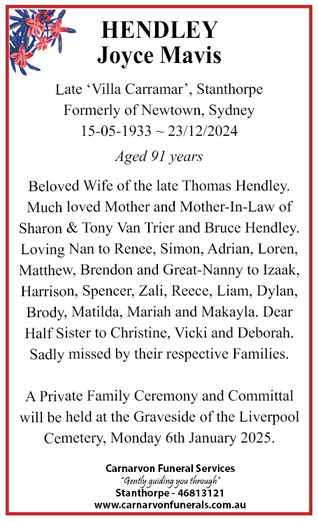 Hendley, Joyce Mavis Carnarvon Funeral Services Our sincere and deepest condolences to the Hendley Family. Required Field Message FromMessage To:Click below to send your messages to the correct Family.—Abbott, Terence George "Terry"Achille, RoseALBERTON ElizabethAllan, Dennis WilliamAllum, Shirlie JeanANDERSON Wyndham Macdonald (Mac)Appleton, Renee JaneArden, Stephanie AnnAtkinson, Alwine IsobelAuliff, Ralph PeterBACCHETTI BrunaBAILEY Peter JohnBainbridge, Ian FrankBaker, Barry WalterBallinger, JuneBamberry, Doris MerleBarber, Julie MaragaretBarbierato, DarioBARKER Ronald WilliamBarker, Richard James 'Dick'Barlow, Stanley LewisBarnett, Phyllis MargaretBarry, Graham Thomas JosephBarry, Robert JohnBartlett, Allen GeorgeBaseggio, MariaBates, Henry ErwinBathersby, Michael ConquestBathersby, Muriel AileenBatki, VinceBATTEN Micheal StephenBATTERHAM KEVIN BRUCE (SKIPPY)Batterham Trevor JohnBatterham, Donald ThomasBatterham, Gail RuthBatterham, Maurice LyalBatterham, Noel Bradman "Blue"BAUSCH Joan ShirleyBeahan, KevinBEAHAN, Patrick GerardBeard, Joan IsobelBeattie, George HenryBeckett, Douglas JohnBeddow, RitaBELFORD KeithBELL Zonya Wendee JoyBell, Colin DavidBell, Jewell Cora JoanBELLERI Rosa - BELLERI JimBENNETT Victor FredrickBERLESE ErmenegildoBerlese, ErnestaBERNOTH GlennBertinazzi, Lorenzo BrunoBertram, Doris JeanBIDDLE Maxwell Eric (Max)Binkins, Michael PaulBlack, Brian JohnBlank, Sydney Joseph (Syd)Blue ChristmasBlue Christmas 2024Blundell, Peter CharlesBlundell, Peter WarrenBolton, Janice EvelynBolton, Leslie WilliamBONETTO Adelina (Linda) FrassettoBonner, Peter RolandBonner, Therese 'Tere'Bonner, William Edgar 'Bill'Bonoguore, Michael JohnBOOTH Grahame SidneyBosel, Madeline RubyBoston, Shirley AnnBOTT Peter JohnBott, Ruth JoyceBoucher, Michael NeilBougoure, ElaineBOUGOURE, EuniceBourne, Joan Alix FitzroyBourzali, Zineb Agnes (Zina)Boyce, Edward Peter (Ted)Boyce, Joseph John "Joe"BOYLE Vincent Thomas (Pat)Bradford, Patricia Faye 'Pat'BRADY Brian JohnBRADY Patrick Arthur (Stubby)Brandrett, AnthonyBRISOTTO Dino GiorgioBrisotto, Gianni Vincenzo (John)Brisotto, Melanie NicoleBrown, Dawn LatriciaBrown, June MaryBrown, Ronald "Joe"Brown, Veda JoyceBROWNE William JosephBrowne, Mary MillicentBurger, Louisa Angenita JohannaBURGES MaureenBURMESTER JeanburnsBurns, Margaret MaryBurns, Thomas Charles "Tom"BURTON, Charles Francis Boysen "Boyce"Burton, David CharlesBurton, Roslyn Christine (Roz)Buscher, Jochen (Joe)Bush, Kenneth CharlesButler, Mavis BerylButler, Olive HelenButler, Trevor FrancisBykowski, Marilyn AnnCALA SebastianoCALOTTI Maria AntoniaCannavo, CarmeloCantarella, LugiaCantwell, Daniel JamesCANU Giuseppe Antonio SebastianoCaporali, Luigia Josephine (Josie)Capuzzo, ImmacolatoCardillo, CesareCarnell, Elizabeth MarjorieCarniel, AngelinaCarniel, Eugenio 'Eugene'Carson, Paul AlanCarter, Sydney BernardCARUSO CarmeloCaruso, GraziaCaruso, RossCasella, RosaCaslick, Stephen DavidCattarin, Gabriel ChristianCaulley, Ann GwendolenCave, Marjorie LillianChaplin, Ian LenardChapman, IreneChapman, Maxwell RaymondCharlwood, Anthony "Tony"CHERRY James LyleCicvarova, MariaCividini, Drago (Karl)CLARK Francis Graham JohnClark, Dolores (Shirley)CLARKE Barrymore Francis (Barry)Clarke, Mary HendersonCobon, Helen MayCoco, Salvatore 'Sam'COGHLAN Gary VerdumCoghlan, Noel William MichaelCole, Carolyn JanelleCOLLEY CarmelCollins, Kathleen DigbyCollins, Lisa GayeCollins, Lorna GwenColyer, TammyConnell Andrew 'Andy'Contarino, FrancescaCook, Patricia MayCooke, Adrian (John)CORKILL ThoraCorkill, MervynCorkill, Mervyn DanielCOSMO Doris JuneCourtney, Stephen WilliamCOWAN Jonathan DouglasCrang, Mavis VioletCrema, Mario CelesteCrisp, Lillian MaeCrisp, Neil TrevorCristina, Dawn MayCROMBIE Ian WilliamCROME RosemaryCrome, Doreene BettyCURRAN Audrey JoanCutuli, AngeloDachs, Beryl MargaretDachs, Helena EleanorDachs, Kerry JamesDACHS, Kym MichelleDalgity, Francis Alexander "Frank"DANIELLS Trevor JohnDaraz, SlavicaDART, Elizabeth AnneDay, Desmond Bernard (Des)Day, Douglas GeorgeDay, Kevin ThomasDay, Wayne SimonDean, Michael PhillipDEZUANNI, Eugenio 'Genio'DIBBLE Joan FrancesDibble, GrahamDipple, Lyndsay Thomas MeakinDonges, Carolyn JuneDonges, Frances LillieDonges, Joanne KathleenDONNELL Andrew WilliamDOORLEY Dorothy ClareDoorley, Peter RaymondDoro, Barry WilliamDOWDING Donald AngusDRAHEIM Ernest Allan (Ernie)Drake JackDUCK, Estelle FlorenceDunbar, Kenneth James "Kenny"Duncan, Elizabeth EstherDunn John WellwoodDunn, Dawn AdeleDunn, John WellwoodDunn, Peter JohnEbenestelli, GiovannaEgan, Barbara AnneEINAM Olwen NellieEinam, Raymond GeorgeEinam, Rita AliceEinam, Ronald Bruce 'Bruce'ELDRIDGE Beryl Joyce (nee Fossey)Elliot,Elliot, Geoffrey MaxwellEscolar, Tomas "Tom"Espulso, RosinaEvelyn-Liardet, David RoyEzzy, Douglas John (Doug)Fairbairn, Elaine MaryFarrell, Claudia MaryFAULKNER Alma ElizabethFawcett, HerbertFearnside, Linda JoanFEATHERSTONE Alma JosephineFERRIER Helen JeanFichera, MarioFILIPETTO FilomenaFletcher, Kevin SidneyFLOOD Stephen GeorgeFogarty, Kevin 'John'Forbes, Edwin FrederickForesto, Giovanni (John)Forsythe, Gwendolyne PatriciaFoskett, Christine ElizabethFoster, Helen ElizabethFoster, Vicki AnnFrancia, Anna MariaFreeman, Warrick AndesonFRESHWATER WinifredFuller, BettyFunk, Gordon John (Flash)Gaitskell, Faye AnnGalagher, Robert CharlesGangemi, FrancesGangemi, Giovanni "Johnny"Gangemi, GiuseppeGarcia, Margaret ElizabethGARDINER Wayne (Whisky)Gargiulo, Christopher JohnGARTH, Bernard JohnGarth, Kathleen NaomiGASKE Morgan DavidGasparin, TerryGastaldon, FlorindoGava, Warren Alexander 'Wazza'Gearing, Norman Stanley "Norm"George, Marie MayGilmour, Allan CharlesGilmour, Geoffrey HaroldGilmour, Patricia MaryGim, Alan RoyGIMM Ian KennethGimm, Beverley MayGimm, JeanGimm, Kevin LionelGimm, Rose AgnesGLEESON Neil Edward (Ginge)Gleeson, AnneGodman, Norma JanetGOEBEL Elaine AgnesGoodwin, Scott RonaldGoodyear, Mervyn LeslieGoodyear, Ronald Thomas (Cook)GOSSOW JeanGraham, AgripinaGraham, Noel WalkerGrammatico, Salvatore "Sam"Grant, Elsi