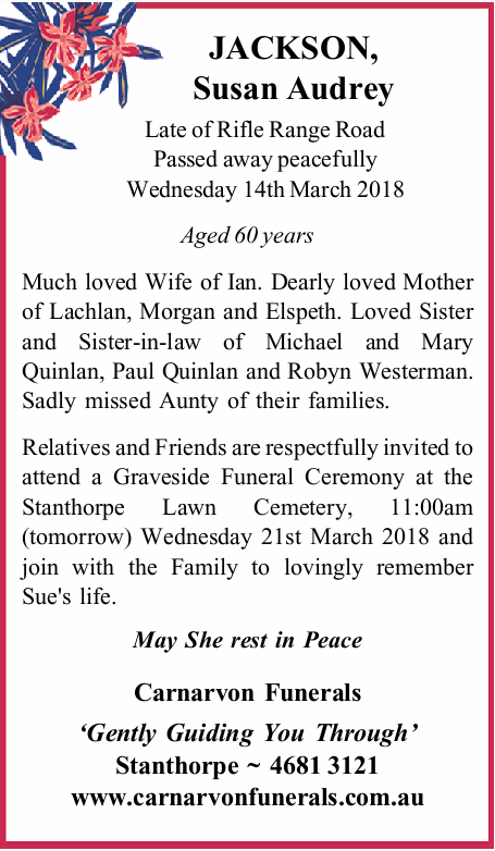 MY WIFE AND ARE SO VERY SORRY TO HERE ABOUT THE LOSS OF SUCH A LOVING COUPLE I ONLY JUST FOUND OUT NOW AS I WAS ON THE INTERNET TO SEE IF THEY WERE STILL LIVING IN STANTHORPE AS WE ARE COMING THROUGH THERE IN 2 WEEKS TIME . THEY WERE MY AUNTIE AND UNCLE AND I HAD NOT SEEN THEM IN YEARS AND I HAVE NOT SEEN MARK OR LEWIS FOR ABOUT 55 YRS ONCE AGAIN OUR DEEPEST SYMPATHY FOR YOUR LOSS