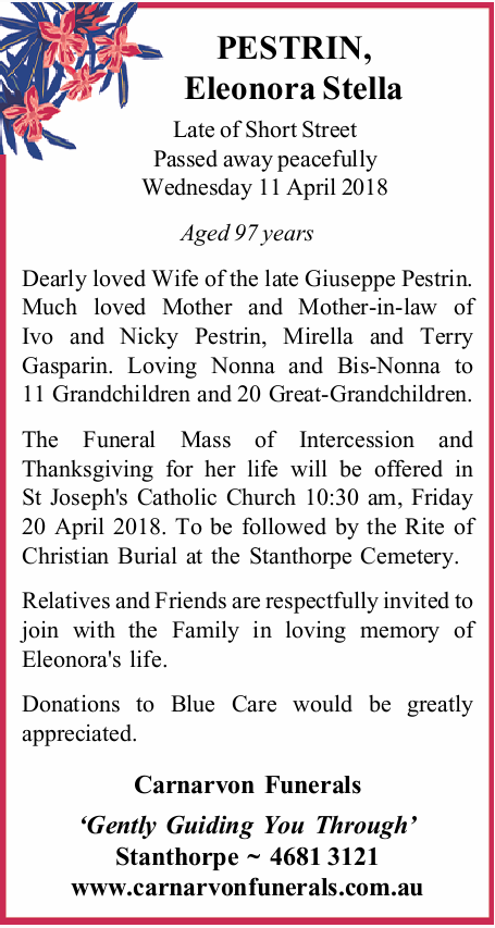 Codolences to Norma Bertinazzi and respective families on the passing of Bruno who was a dear friend for many, many years.He was a great man and will always be remembered. Vale Bruno you are in God s hands.From Sam Testa and Family.Sorry for your loss.