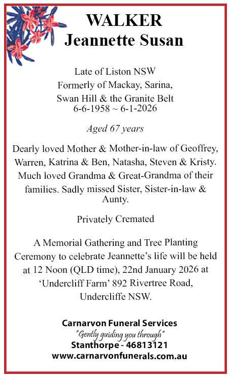 Walker, Jeannette Susan Carnarvon Funeral Services Our sincere and deepest condolences to the Walker Family. Required Field Message FromMessage To:Click below to send your messages to the correct Family.—Abbott, Terence George "Terry"Achille, RoseALBERTON ElizabethAllan, Dennis WilliamAllum, Shirlie JeanANDERSON Wyndham Macdonald (Mac)Appleton, Renee JaneArden, Stephanie AnnAtkinson, Alwine IsobelAuliff, Ralph PeterBACCHETTI BrunaBAILEY Peter JohnBainbridge, Ian FrankBaker, Barry WalterBallinger, JuneBamberry, Doris MerleBarber, Julie MaragaretBarbierato, DarioBARKER Ronald WilliamBarker, Richard James 'Dick'Barlow, Stanley LewisBarnett, Phyllis MargaretBarry, Graham Thomas JosephBarry, Robert JohnBartlett, Allen GeorgeBaseggio, MariaBates, Henry ErwinBathersby, Michael ConquestBathersby, Muriel AileenBatki, VinceBATTEN Micheal StephenBATTERHAM KEVIN BRUCE (SKIPPY)Batterham Trevor JohnBatterham, Donald ThomasBatterham, Gail RuthBatterham, Maurice LyalBatterham, Noel Bradman "Blue"BAUSCH Joan ShirleyBeahan, KevinBEAHAN, Patrick GerardBeard, Joan IsobelBeattie, George HenryBeckett, Douglas JohnBeddow, RitaBELFORD KeithBELL Zonya Wendee JoyBell, Colin DavidBell, Jewell Cora JoanBELLERI Rosa - BELLERI JimBENNETT Victor FredrickBERLESE ErmenegildoBerlese, ErnestaBERNOTH GlennBertinazzi, Lorenzo BrunoBertram, Doris JeanBIDDLE Maxwell Eric (Max)Binkins, Michael PaulBlack, Brian JohnBlank, Sydney Joseph (Syd)Blue ChristmasBlue Christmas 2024Blundell, Peter CharlesBlundell, Peter WarrenBolton, Janice EvelynBolton, Leslie WilliamBONETTO Adelina (Linda) FrassettoBonner, Peter RolandBonner, Therese 'Tere'Bonoguore, Michael JohnBOOTH Grahame SidneyBosel, Madeline RubyBoston, Shirley AnnBOTT Peter JohnBott, Ruth JoyceBoucher, Michael NeilBougoure, ElaineBOUGOURE, EuniceBourne, Joan Alix FitzroyBourzali, Zineb Agnes (Zina)Boyce, Edward Peter (Ted)Boyce, Joseph John "Joe"BOYLE Vincent Thomas (Pat)Bradford, Patricia Faye 'Pat'BRADY Brian JohnBRADY Patrick Arthur (Stubby)Brandrett, AnthonyBRISOTTO Dino GiorgioBrisotto, Gianni Vincenzo (John)Brisotto, Melanie NicoleBrown, Dawn LatriciaBrown, June MaryBrown, Ronald "Joe"Brown, Veda JoyceBROWNE William JosephBrowne, Mary MillicentBurger, Louisa Angenita JohannaBURGES MaureenBURMESTER JeanburnsBurns, Margaret MaryBurns, Thomas Charles "Tom"BURTON, Charles Francis Boysen "Boyce"Burton, David CharlesBurton, Roslyn Christine (Roz)Buscher, Jochen (Joe)Bush, Kenneth CharlesButler, Mavis BerylButler, Olive HelenButler, Trevor FrancisBykowski, Marilyn AnnCALA SebastianoCALOTTI Maria AntoniaCannavo, CarmeloCantarella, LugiaCantwell, Daniel JamesCANU Giuseppe Antonio SebastianoCaporali, Luigia Josephine (Josie)Capuzzo, ImmacolatoCardillo, CesareCarnell, Elizabeth MarjorieCarniel, AngelinaCarniel, Eugenio 'Eugene'Carson, Paul AlanCarter, Sydney BernardCARUSO CarmeloCaruso, GraziaCaruso, RossCasella, RosaCaslick, Stephen DavidCattarin, Gabriel ChristianCaulley, Ann GwendolenCave, Marjorie LillianChaplin, Ian LenardChapman, IreneChapman, Maxwell RaymondCharlwood, Anthony "Tony"CHERRY James LyleCicvarova, MariaCividini, Drago (Karl)CLARK Francis Graham JohnClark, Dolores (Shirley)CLARKE Barrymore Francis (Barry)Clarke, Mary HendersonCobon, Helen MayCoco, Salvatore 'Sam'COGHLAN Gary VerdumCoghlan, Noel William MichaelCole, Carolyn JanelleCOLLEY CarmelCollins, Kathleen DigbyCollins, Lisa GayeCollins, Lorna GwenColyer, TammyConnell Andrew 'Andy'Contarino, FrancescaCook, Patricia MayCooke, Adrian (John)CORKILL ThoraCorkill, MervynCorkill, Mervyn DanielCOSMO Doris JuneCourtney, Stephen WilliamCOWAN Jonathan DouglasCrang, Mavis VioletCrema, Mario CelesteCrisp, Lillian MaeCrisp, Neil TrevorCristina, Dawn MayCROMBIE Ian WilliamCROME RosemaryCrome, Doreene BettyCURRAN Audrey JoanCutuli, AngeloDachs, Beryl MargaretDachs, Helena EleanorDachs, Kerry JamesDACHS, Kym MichelleDalgity, Francis Alexander "Frank"DANIELLS Trevor JohnDaraz, SlavicaDART, Elizabeth AnneDay, Desmond Bernard (Des)Day, Douglas GeorgeDay, Kevin ThomasDay, Wayne SimonDean, Michael PhillipDEZUANNI, Eugenio 'Genio'DIBBLE Joan FrancesDibble, GrahamDipple, Lyndsay Thomas MeakinDonges, Carolyn JuneDonges, Frances LillieDonges, Joanne KathleenDONNELL Andrew WilliamDOORLEY Dorothy ClareDoorley, Peter RaymondDoro, Barry WilliamDOWDING Donald AngusDRAHEIM Ernest Allan (Ernie)Drake JackDUCK, Estelle FlorenceDunbar, Kenneth James "Kenny"Duncan, Elizabeth EstherDunn John WellwoodDunn, Dawn AdeleDunn, John WellwoodDunn, Peter JohnEbenestelli, GiovannaEgan, Barbara AnneEINAM Olwen NellieEinam, Raymond GeorgeEinam, Rita AliceEinam, Ronald Bruce 'Bruce'ELDRIDGE Beryl Joyce (nee Fossey)Elliot,Elliot, Geoffrey MaxwellEscolar, Tomas "Tom"Espulso, RosinaEvelyn-Liardet, David RoyEzzy, Douglas John (Doug)Fairbairn, Elaine MaryFarrell, Claudia MaryFAULKNER Alma ElizabethFawcett, HerbertFearnside, Linda JoanFEATHERSTONE Alma JosephineFERRIER Helen JeanFichera, MarioFILIPETTO FilomenaFletcher, Kevin SidneyFLOOD Stephen GeorgeFogarty, Kevin 'John'Forbes, Edwin FrederickForesto, Giovanni (John)Forsythe, Gwendolyne PatriciaFoskett, Christine ElizabethFoster, Helen ElizabethFoster, Vicki AnnFrancia, Anna MariaFreeman, Warrick AndesonFRESHWATER WinifredFuller, BettyFunk, Gordon John (Flash)Gaitskell, Faye AnnGalagher, Robert CharlesGangemi, FrancesGangemi, Giovanni "Johnny"Gangemi, GiuseppeGarcia, Margaret ElizabethGARDINER Wayne (Whisky)Gargiulo, Christopher JohnGARTH, Bernard JohnGarth, Kathleen NaomiGASKE Morgan DavidGasparin, TerryGastaldon, FlorindoGearing, Norman Stanley "Norm"George, Marie MayGilmour, Allan CharlesGilmour, Geoffrey HaroldGilmour, Patricia MaryGim, Alan RoyGIMM Ian KennethGimm, Beverley MayGimm, JeanGimm, Kevin LionelGimm, Rose AgnesGLEESON Neil Edward (Ginge)Gleeson, AnneGodman, Norma JanetGOEBEL Elaine AgnesGoodwin, Scott RonaldGoodyear, Mervyn LeslieGoodyear, Ronald Thomas (Cook)GOSSOW JeanGraham, AgripinaGraham, Noel WalkerGrammatico, Salvatore "Sam"Grant, Elsie VeraGray, DorisGRAYSON Robert SpencerGreen, Dorothy He
