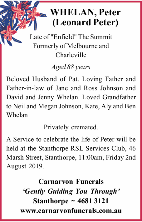 Whelan, Peter Carnarvon Funeral Services Our sincere and deepest condolences to the Whelan Family. Required Field Message FromMessage To:Click below to send your messages to the correct Family.—Abbott, Terence George "Terry"Achille, RoseAdams, Robert JohnALBERTON ElizabethAllan, Dennis WilliamAllum, Shirlie JeanANDERSON Wyndham Macdonald (Mac)Appleton, Renee JaneArden, Stephanie AnnAtkinson, Alwine IsobelAuliff, Ralph PeterBACCHETTI BrunaBAILEY Peter JohnBainbridge, Ian FrankBaker, Barry WalterBallinger, JuneBamberry, Doris MerleBarber, Julie MaragaretBarbierato, DarioBARKER Ronald WilliamBarker, Richard James 'Dick'Barlow, Stanley LewisBarnett, Phyllis MargaretBarry, Graham Thomas JosephBarry, Robert JohnBartlett, Allen GeorgeBaseggio, MariaBates, Henry ErwinBathersby, Michael ConquestBathersby, Muriel AileenBatki, VinceBATTEN Micheal StephenBATTERHAM KEVIN BRUCE (SKIPPY)Batterham Trevor JohnBatterham, Donald ThomasBatterham, Gail RuthBatterham, Maurice LyalBatterham, Noel Bradman "Blue"BAUSCH Joan ShirleyBeahan, KevinBEAHAN, Patrick GerardBeard, Joan IsobelBeattie, George HenryBeckett, Douglas JohnBeddow, RitaBELFORD KeithBELL Zonya Wendee JoyBell, Colin DavidBell, Jewell Cora JoanBELLERI Rosa - BELLERI JimBENNETT Victor FredrickBERLESE ErmenegildoBerlese, ErnestaBERNOTH GlennBertinazzi, Lorenzo BrunoBertram, Doris JeanBIDDLE Maxwell Eric (Max)Binkins, Michael PaulBlack, Brian JohnBlank, Sydney Joseph (Syd)Blue ChristmasBlue Christmas 2024Blundell, Peter CharlesBlundell, Peter WarrenBolton, Janice EvelynBolton, Leslie WilliamBONETTO Adelina (Linda) FrassettoBonner, Peter RolandBonner, Therese 'Tere'Bonner, William Edgar 'Bill'Bonoguore, Michael JohnBOOTH Grahame SidneyBosel, Madeline RubyBoston, Shirley AnnBOTT Peter JohnBott, Ruth JoyceBoucher, Michael NeilBougoure, ElaineBOUGOURE, EuniceBourne, Joan Alix FitzroyBourzali, Zineb Agnes (Zina)Boyce, Edward Peter (Ted)Boyce, Joseph John "Joe"BOYLE Vincent Thomas (Pat)Bradford, Patricia Faye 'Pat'BRADY Brian JohnBRADY Patrick Arthur (Stubby)Brandrett, AnthonyBRISOTTO Dino GiorgioBrisotto, Gianni Vincenzo (John)Brisotto, Melanie NicoleBrown, Dawn LatriciaBrown, June MaryBrown, Ronald "Joe"Brown, Veda JoyceBROWNE William JosephBrowne, Mary MillicentBurger, Louisa Angenita JohannaBURGES MaureenBURMESTER JeanburnsBurns, Margaret MaryBurns, Thomas Charles "Tom"BURTON, Charles Francis Boysen "Boyce"Burton, David CharlesBurton, Roslyn Christine (Roz)Buscher, Jochen (Joe)Bush, Kenneth CharlesButler, Mavis BerylButler, Olive HelenButler, Trevor FrancisBykowski, Marilyn AnnCALA SebastianoCALOTTI Maria AntoniaCannavo, CarmeloCantarella, LugiaCantwell, Daniel JamesCANU Giuseppe Antonio SebastianoCaporali, Luigia Josephine (Josie)Capuzzo, ImmacolatoCardillo, CesareCarnell, Elizabeth MarjorieCarniel, AngelinaCarniel, Eugenio 'Eugene'Carson, Paul AlanCarter, Sydney BernardCARUSO CarmeloCaruso, GraziaCaruso, RossCasella, RosaCaslick, Stephen DavidCattarin, Gabriel ChristianCaulley, Ann GwendolenCave, Marjorie LillianChaplin, Ian LenardChapman, IreneChapman, Maxwell RaymondCharlwood, Anthony "Tony"CHERRY James LyleCicvarova, MariaCividini, Drago (Karl)CLARK Francis Graham JohnClark, Dolores (Shirley)CLARKE Barrymore Francis (Barry)Clarke, Mary HendersonClegg, Beverley AnnCobon, Helen MayCoco, Salvatore 'Sam'COGHLAN Gary VerdumCoghlan, Noel William MichaelCole, Carolyn JanelleCOLLEY CarmelCollins, Kathleen DigbyCollins, Lisa GayeCollins, Lorna GwenColyer, TammyConnell Andrew 'Andy'Contarino, FrancescaCook, Patricia MayCooke, Adrian (John)CORKILL ThoraCorkill, MervynCorkill, Mervyn DanielCOSMO Doris JuneCourtney, Stephen WilliamCOWAN Jonathan DouglasCrang, Mavis VioletCrema, Mario CelesteCrisp, Lillian MaeCrisp, Neil TrevorCristina, Dawn MayCROMBIE Ian WilliamCROME RosemaryCrome, Doreene BettyCURRAN Audrey JoanCutuli, AngeloDachs, Beryl MargaretDachs, Helena EleanorDachs, Kerry JamesDACHS, Kym MichelleDalgity, Francis Alexander "Frank"DANIELLS Trevor JohnDaraz, SlavicaDART, Elizabeth AnneDay, Desmond Bernard (Des)Day, Douglas GeorgeDay, Kevin ThomasDay, Wayne SimonDean, Michael PhillipDEZUANNI, Eugenio 'Genio'DIBBLE Joan FrancesDibble, GrahamDipple, Lyndsay Thomas MeakinDonges, Carolyn JuneDonges, Frances LillieDonges, Joanne KathleenDONNELL Andrew WilliamDOORLEY Dorothy ClareDoorley, Peter RaymondDoro, Barry WilliamDOWDING Donald AngusDRAHEIM Ernest Allan (Ernie)Drake JackDUCK, Estelle FlorenceDunbar, Kenneth James "Kenny"Duncan, Elizabeth EstherDunn John WellwoodDunn, Dawn AdeleDunn, John WellwoodDunn, Peter JohnEbenestelli, GiovannaEgan, Barbara AnneEINAM Olwen NellieEinam, Raymond GeorgeEinam, Rita AliceEinam, Ronald Bruce 'Bruce'ELDRIDGE Beryl Joyce (nee Fossey)Elliot,Elliot, Geoffrey MaxwellEscolar, Tomas "Tom"Espulso, RosinaEvelyn-Liardet, David RoyEzzy, Douglas John (Doug)Fairbairn, Elaine MaryFarrell, Claudia MaryFAULKNER Alma ElizabethFawcett, HerbertFearnside, Linda JoanFEATHERSTONE Alma JosephineFERRIER Helen JeanFichera, MarioFILIPETTO FilomenaFletcher, Kevin SidneyFLOOD Stephen GeorgeFogarty, Kevin 'John'Forbes, Edwin FrederickForesto, Giovanni (John)Forsythe, Gwendolyne PatriciaFoskett, Christine ElizabethFoster, Helen ElizabethFoster, Vicki AnnFrancia, Anna MariaFreeman, Warrick AndesonFRESHWATER WinifredFuller, BettyFunk, Gordon John (Flash)Gaitskell, Faye AnnGalagher, Robert CharlesGangemi, FrancesGangemi, Giovanni "Johnny"Gangemi, GiuseppeGarcia, Margaret ElizabethGARDINER Wayne (Whisky)Gardiner, Loree LorraineGargiulo, Christopher JohnGARTH, Bernard JohnGarth, Kathleen NaomiGASKE Morgan DavidGasparin, TerryGastaldon, FlorindoGava, Warren Alexander 'Wazza'Gearing, Norman Stanley "Norm"George, Marie MayGilbert, Mervyn LeonardGilmour, Allan CharlesGilmour, Geoffrey HaroldGilmour, Patricia MaryGim, Alan RoyGIMM Ian KennethGimm, Beverley MayGimm, JeanGimm, Kevin LionelGimm, Rose AgnesGLEESON Neil Edward (Ginge)Gleeson, AnneGodman, Norma JanetGOEBEL Elaine AgnesGoodwin, Scott RonaldGoodyear, Mervyn LeslieGoodyear, Ronald Thomas (Cook)GOSSOW J
