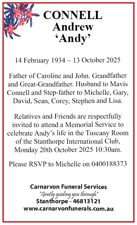 Connell, Andrew ‘Andy’ Live Stream Link https://betterwaytostream.com.au/ Watch Event Passcode: 14-02-1934 Carnarvon Funeral Services Our sincere and deepest condolences to the Connell Family. Required Field Message FromMessage To:Click below to send your messages to the correct Family.—Abbott, Terence George "Terry"ALBERTON ElizabethAllan, Dennis WilliamAllum, Shirlie JeanANDERSON Wyndham Macdonald (Mac)Appleton, Renee JaneArden, Stephanie AnnAtkinson, Alwine IsobelAuliff, Ralph PeterBACCHETTI BrunaBAILEY Peter JohnBainbridge, Ian FrankBaker, Barry WalterBallinger, JuneBamberry, Doris MerleBarber, Julie MaragaretBarbierato, DarioBARKER Ronald WilliamBarker, Richard James 'Dick'Barlow, Stanley LewisBarry, Graham Thomas JosephBarry, Robert JohnBartlett, Allen GeorgeBaseggio, MariaBates, Henry ErwinBathersby, Michael ConquestBathersby, Muriel AileenBatki, VinceBATTEN Micheal StephenBATTERHAM KEVIN BRUCE (SKIPPY)Batterham Trevor JohnBatterham, Gail RuthBatterham, Maurice LyalBatterham, Noel Bradman "Blue"BAUSCH Joan ShirleyBeahan, KevinBEAHAN, Patrick GerardBeard, Joan IsobelBeattie, George HenryBeckett, Douglas JohnBeddow, RitaBELFORD KeithBELL Zonya Wendee JoyBell, Colin DavidBell, Jewell Cora JoanBELLERI Rosa - BELLERI JimBENNETT Victor FredrickBERLESE ErmenegildoBerlese, ErnestaBERNOTH GlennBertinazzi, Lorenzo BrunoBertram, Doris JeanBIDDLE Maxwell Eric (Max)Binkins, Michael PaulBlack, Brian JohnBlank, Sydney Joseph (Syd)Blue ChristmasBlue Christmas 2024Blundell, Peter CharlesBlundell, Peter WarrenBolton, Janice EvelynBolton, Leslie WilliamBONETTO Adelina (Linda) FrassettoBonner, Peter RolandBonner, Therese 'Tere'Bonoguore, Michael JohnBOOTH Grahame SidneyBosel, Madeline RubyBoston, Shirley AnnBOTT Peter JohnBott, Ruth JoyceBoucher, Michael NeilBougoure, ElaineBOUGOURE, EuniceBourne, Joan Alix FitzroyBourzali, Zineb Agnes (Zina)Boyce, Edward Peter (Ted)Boyce, Joseph John "Joe"BOYLE Vincent Thomas (Pat)BRADY Brian JohnBRADY Patrick Arthur (Stubby)Brandrett, AnthonyBRISOTTO Dino GiorgioBrisotto, Gianni Vincenzo (John)Brisotto, Melanie NicoleBrown, Dawn LatriciaBrown, June MaryBrown, Ronald "Joe"Brown, Veda JoyceBROWNE William JosephBrowne, Mary MillicentBurger, Louisa Angenita JohannaBURGES MaureenBURMESTER JeanburnsBurns, Margaret MaryBurns, Thomas Charles "Tom"BURTON, Charles Francis Boysen "Boyce"Burton, David CharlesBurton, Roslyn Christine (Roz)Buscher, Jochen (Joe)Bush, Kenneth CharlesButler, Mavis BerylButler, Olive HelenButler, Trevor FrancisBykowski, Marilyn AnnCALA SebastianoCALOTTI Maria AntoniaCannavo, CarmeloCantarella, LugiaCantwell, Daniel JamesCANU Giuseppe Antonio SebastianoCaporali, Luigia Josephine (Josie)Capuzzo, ImmacolatoCardillo, CesareCarnell, Elizabeth MarjorieCarniel, AngelinaCarniel, Eugenio 'Eugene'Carson, Paul AlanCarter, Sydney BernardCARUSO CarmeloCaruso, GraziaCaruso, RossCasella, RosaCaslick, Stephen DavidCattarin, Gabriel ChristianCaulley, Ann GwendolenCave, Marjorie LillianChaplin, Ian LenardChapman, IreneChapman, Maxwell RaymondCharlwood, Anthony "Tony"CHERRY James LyleCicvarova, MariaCividini, Drago (Karl)CLARK Francis Graham JohnClark, Dolores (Shirley)CLARKE Barrymore Francis (Barry)Clarke, Mary HendersonCobon, Helen MayCoco, Salvatore 'Sam'COGHLAN Gary VerdumCoghlan, Noel William MichaelCole, Carolyn JanelleCOLLEY CarmelCollins, Kathleen DigbyCollins, Lisa GayeCollins, Lorna GwenColyer, TammyConnell Andrew 'Andy'Contarino, FrancescaCook, Patricia MayCooke, Adrian (John)CORKILL ThoraCorkill, MervynCorkill, Mervyn DanielCOSMO Doris JuneCourtney, Stephen WilliamCOWAN Jonathan DouglasCrang, Mavis VioletCrema, Mario CelesteCrisp, Lillian MaeCrisp, Neil TrevorCristina, Dawn MayCROMBIE Ian WilliamCROME RosemaryCrome, Doreene BettyCURRAN Audrey JoanCutuli, AngeloDachs, Beryl MargaretDachs, Helena EleanorDachs, Kerry JamesDACHS, Kym MichelleDalgity, Francis Alexander "Frank"DANIELLS Trevor JohnDaraz, SlavicaDART, Elizabeth AnneDay, Desmond Bernard (Des)Day, Douglas GeorgeDay, Kevin ThomasDay, Wayne SimonDean, Michael PhillipDEZUANNI, Eugenio 'Genio'DIBBLE Joan FrancesDibble, GrahamDipple, Lyndsay Thomas MeakinDonges, Carolyn JuneDonges, Frances LillieDonges, Joanne KathleenDONNELL Andrew WilliamDOORLEY Dorothy ClareDoro, Barry WilliamDOWDING Donald AngusDRAHEIM Ernest Allan (Ernie)Drake JackDUCK, Estelle FlorenceDunbar, Kenneth James "Kenny"Duncan, Elizabeth EstherDunn John WellwoodDunn, Dawn AdeleDunn, John WellwoodDunn, Peter JohnEbenestelli, GiovannaEgan, Barbara AnneEINAM Olwen NellieEinam, Raymond GeorgeEinam, Rita AliceEinam, Ronald Bruce 'Bruce'ELDRIDGE Beryl Joyce (nee Fossey)Elliot,Elliot, Geoffrey MaxwellEscolar, Tomas "Tom"Espulso, RosinaEvelyn-Liardet, David RoyEzzy, Douglas John (Doug)Fairbairn, Elaine MaryFarrell, Claudia MaryFAULKNER Alma ElizabethFawcett, HerbertFearnside, Linda JoanFEATHERSTONE Alma JosephineFERRIER Helen JeanFichera, MarioFILIPETTO FilomenaFletcher, Kevin SidneyFLOOD Stephen GeorgeFogarty, Kevin 'John'Forbes, Edwin FrederickForesto, Giovanni (John)Forsythe, Gwendolyne PatriciaFoskett, Christine ElizabethFoster, Helen ElizabethFoster, Vicki AnnFrancia, Anna MariaFreeman, Warrick AndesonFRESHWATER WinifredFuller, BettyFunk, Gordon John (Flash)Gaitskell, Faye AnnGalagher, Robert CharlesGangemi, FrancesGangemi, Giovanni "Johnny"Gangemi, GiuseppeGarcia, Margaret ElizabethGARDINER Wayne (Whisky)Gargiulo, Christopher JohnGARTH, Bernard JohnGarth, Kathleen NaomiGASKE Morgan DavidGastaldon, FlorindoGearing, Norman Stanley "Norm"George, Marie MayGilmour, Allan CharlesGilmour, Geoffrey HaroldGilmour, Patricia MaryGim, Alan RoyGIMM Ian KennethGimm, Beverley MayGimm, JeanGimm, Kevin LionelGimm, Rose AgnesGLEESON Neil Edward (Ginge)Gleeson, AnneGodman, Norma JanetGOEBEL Elaine AgnesGoodwin, Scott RonaldGoodyear, Mervyn LeslieGoodyear, Ronald Thomas (Cook)GOSSOW JeanGraham, AgripinaGraham, Noel WalkerGrammatico, Salvatore "Sam"Grant, Elsie VeraGray, DorisGRAYSON Robert SpencerGreen, Dorothy Helen (Dot)Greggor, Harry LawrenceGregori,