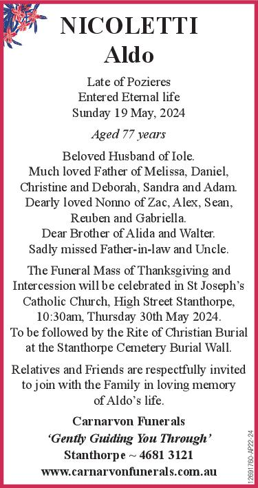 Nicoletti, Aldo Carnarvon Funeral Services Our sincere and deepest condolences to the Nicoletti Family. Mariah ReidCondolences to the family. You were a beautiful soul to care for. ❤️ r.i.p aldoBruno and Cathy STEFANONOur deepest condolences to you Iole and all your family. Our thoughts and prayers are with you at this sad time. God Bless 🙏Carmela NicastroTo Iole and family my deepest sympathy in your sad loss. Thinking of you all.Frank & Joanne MusumeciOur deepest sympathies to all the families and friends. Frank and Joanne Musumeci and familyVilma and Stephen SmithOur thoughts are with you and your family during this very sad time.Renato & Noelene AndreattaOur thoughts are with you and your family at this very say time. Our Deepest SympathyRenato & Noelene AndreattaOur deepest sympathy for your sad loss. Thinking of you allVicki McCullaghDeepest sympathy to all Nicolette family Required Field Message FromMessage To:Click below to send your messages to the correct Family.—Abbott, Terence George "Terry"Achille, RoseAdams, Robert JohnALBERTON ElizabethAllan, Dennis WilliamAllum, Shirlie JeanANDERSON Wyndham Macdonald (Mac)Appleton, Renee JaneArden, Stephanie AnnAtkinson, Alwine IsobelAuliff, Ralph PeterBACCHETTI BrunaBAILEY Peter JohnBainbridge, Ian FrankBaker, Barry WalterBallinger, JuneBamberry, Doris MerleBarber, Julie MaragaretBarbierato, DarioBARKER Ronald WilliamBarker, Richard James 'Dick'Barlow, Stanley LewisBarnett, Phyllis MargaretBarry, Graham Thomas JosephBarry, Robert JohnBartlett, Allen GeorgeBaseggio, MariaBates, Henry ErwinBathersby, Michael ConquestBathersby, Muriel AileenBatki, VinceBATTEN Micheal StephenBATTERHAM KEVIN BRUCE (SKIPPY)Batterham Trevor JohnBatterham, Donald ThomasBatterham, Gail RuthBatterham, Maurice LyalBatterham, Noel Bradman "Blue"BAUSCH Joan ShirleyBeahan, KevinBEAHAN, Patrick GerardBeard, Joan IsobelBeattie, George HenryBeckett, Douglas JohnBeddow, RitaBELFORD KeithBELL Zonya Wendee JoyBell, Colin DavidBell, Jewell Cora JoanBELLERI Rosa - BELLERI JimBENNETT Victor FredrickBERLESE ErmenegildoBerlese, ErnestaBERNOTH GlennBertinazzi, Lorenzo BrunoBertram, Doris JeanBIDDLE Maxwell Eric (Max)Binkins, Michael PaulBlack, Brian JohnBlank, Sydney Joseph (Syd)Blue ChristmasBlue Christmas 2024Blundell, Peter CharlesBlundell, Peter WarrenBolton, Janice EvelynBolton, Leslie WilliamBONETTO Adelina (Linda) FrassettoBonner, Peter RolandBonner, Therese 'Tere'Bonner, William Edgar 'Bill'Bonoguore, Michael JohnBOOTH Grahame SidneyBosel, Madeline RubyBoston, Shirley AnnBOTT Peter JohnBott, Ruth JoyceBoucher, Michael NeilBougoure, ElaineBOUGOURE, EuniceBourne, Joan Alix FitzroyBourzali, Zineb Agnes (Zina)Boyce, Edward Peter (Ted)Boyce, Joseph John "Joe"BOYLE Vincent Thomas (Pat)Bradford, Patricia Faye 'Pat'BRADY Brian JohnBRADY Patrick Arthur (Stubby)Brandrett, AnthonyBRISOTTO Dino GiorgioBrisotto, Gianni Vincenzo (John)Brisotto, Melanie NicoleBrown, Dawn LatriciaBrown, June MaryBrown, Ronald "Joe"Brown, Veda JoyceBROWNE William JosephBrowne, Mary MillicentBurger, Louisa Angenita JohannaBURGES MaureenBURMESTER JeanburnsBurns, Margaret MaryBurns, Thomas Charles "Tom"BURTON, Charles Francis Boysen "Boyce"Burton, David CharlesBurton, Roslyn Christine (Roz)Buscher, Jochen (Joe)Bush, Kenneth CharlesButler, Mavis BerylButler, Olive HelenButler, Trevor FrancisBykowski, Marilyn AnnCALA SebastianoCALOTTI Maria AntoniaCannavo, CarmeloCantarella, LugiaCantwell, Daniel JamesCANU Giuseppe Antonio SebastianoCaporali, Luigia Josephine (Josie)Capuzzo, ImmacolatoCardillo, CesareCarnell, Elizabeth MarjorieCarniel, AngelinaCarniel, Eugenio 'Eugene'Carson, Paul AlanCarter, Sydney BernardCARUSO CarmeloCaruso, GraziaCaruso, RossCasella, RosaCaslick, Stephen DavidCattarin, Gabriel ChristianCaulley, Ann GwendolenCave, Marjorie LillianChaplin, Ian LenardChapman, IreneChapman, Maxwell RaymondCharlwood, Anthony "Tony"CHERRY James LyleCicvarova, MariaCividini, Drago (Karl)CLARK Francis Graham JohnClark, Dolores (Shirley)CLARKE Barrymore Francis (Barry)Clarke, Mary HendersonClegg, Beverley AnnCobon, Helen MayCoco, Salvatore 'Sam'COGHLAN Gary VerdumCoghlan, Noel William MichaelCole, Carolyn JanelleCOLLEY CarmelCollins, Kathleen DigbyCollins, Lisa GayeCollins, Lorna GwenColyer, TammyConnell Andrew 'Andy'Contarino, FrancescaCook, Patricia MayCooke, Adrian (John)CORKILL ThoraCorkill, MervynCorkill, Mervyn DanielCOSMO Doris JuneCourtney, Stephen WilliamCOWAN Jonathan DouglasCrang, Mavis VioletCrema, Mario CelesteCrisp, Lillian MaeCrisp, Neil TrevorCristina, Dawn MayCROMBIE Ian WilliamCROME RosemaryCrome, Doreene BettyCURRAN Audrey JoanCutuli, AngeloDachs, Beryl MargaretDachs, Helena EleanorDachs, Kerry JamesDACHS, Kym MichelleDalgity, Francis Alexander "Frank"DANIELLS Trevor JohnDaraz, SlavicaDART, Elizabeth AnneDay, Desmond Bernard (Des)Day, Douglas GeorgeDay, Kevin ThomasDay, Wayne SimonDean, Michael PhillipDEZUANNI, Eugenio 'Genio'DIBBLE Joan FrancesDibble, GrahamDipple, Lyndsay Thomas MeakinDonges, Carolyn JuneDonges, Frances LillieDonges, Joanne KathleenDONNELL Andrew WilliamDOORLEY Dorothy ClareDoorley, Peter RaymondDoro, Barry WilliamDOWDING Donald AngusDRAHEIM Ernest Allan (Ernie)Drake JackDUCK, Estelle FlorenceDunbar, Kenneth James "Kenny"Duncan, Elizabeth EstherDunn John WellwoodDunn, Dawn AdeleDunn, John WellwoodDunn, Peter JohnEbenestelli, GiovannaEgan, Barbara AnneEINAM Olwen NellieEinam, Raymond GeorgeEinam, Rita AliceEinam, Ronald Bruce 'Bruce'ELDRIDGE Beryl Joyce (nee Fossey)Elliot,Elliot, Geoffrey MaxwellEscolar, Tomas "Tom"Espulso, RosinaEvelyn-Liardet, David RoyEzzy, Douglas John (Doug)Fairbairn, Elaine MaryFarrell, Claudia MaryFAULKNER Alma ElizabethFawcett, HerbertFearnside, Linda JoanFEATHERSTONE Alma JosephineFERRIER Helen JeanFichera, MarioFILIPETTO FilomenaFletcher, Kevin SidneyFLOOD Stephen GeorgeFogarty, Kevin 'John'Forbes, Edwin FrederickForesto, Giovanni (John)Forsythe, Gwendolyne PatriciaFoskett, Christine ElizabethFoster, Helen ElizabethFoster, Vicki AnnFrancia, An