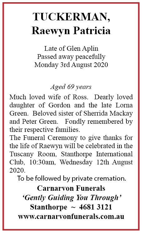 MY WIFE AND ARE SO VERY SORRY TO HERE ABOUT THE LOSS OF SUCH A LOVING COUPLE I ONLY JUST FOUND OUT NOW AS I WAS ON THE INTERNET TO SEE IF THEY WERE STILL LIVING IN STANTHORPE AS WE ARE COMING THROUGH THERE IN 2 WEEKS TIME . THEY WERE MY AUNTIE AND UNCLE AND I HAD NOT SEEN THEM IN YEARS AND I HAVE NOT SEEN MARK OR LEWIS FOR ABOUT 55 YRS ONCE AGAIN OUR DEEPEST SYMPATHY FOR YOUR LOSS