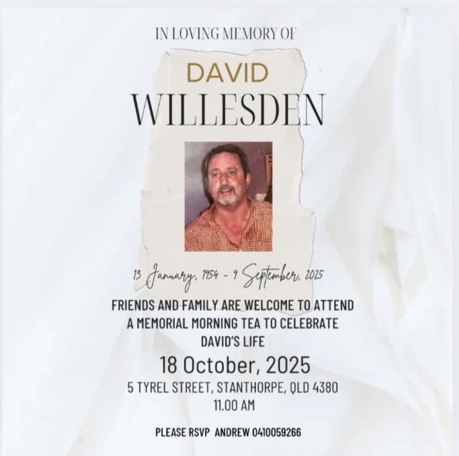 Willesden, David Raymond Carnarvon Funeral Services Our sincere and deepest condolences to the Willesden Family. Required Field Message FromMessage To:Click below to send your messages to the correct Family.—Abbott, Terence George "Terry"ALBERTON ElizabethAllan, Dennis WilliamAllum, Shirlie JeanANDERSON Wyndham Macdonald (Mac)Appleton, Renee JaneArden, Stephanie AnnAtkinson, Alwine IsobelAuliff, Ralph PeterBACCHETTI BrunaBAILEY Peter JohnBainbridge, Ian FrankBaker, Barry WalterBallinger, JuneBamberry, Doris MerleBarber, Julie MaragaretBarbierato, DarioBARKER Ronald WilliamBarker, Richard James 'Dick'Barlow, Stanley LewisBarry, Graham Thomas JosephBarry, Robert JohnBartlett, Allen GeorgeBaseggio, MariaBates, Henry ErwinBathersby, Michael ConquestBathersby, Muriel AileenBatki, VinceBATTEN Micheal StephenBATTERHAM KEVIN BRUCE (SKIPPY)Batterham Trevor JohnBatterham, Gail RuthBatterham, Maurice LyalBatterham, Noel Bradman "Blue"BAUSCH Joan ShirleyBeahan, KevinBEAHAN, Patrick GerardBeard, Joan IsobelBeattie, George HenryBeckett, Douglas JohnBeddow, RitaBELFORD KeithBELL Zonya Wendee JoyBell, Colin DavidBell, Jewell Cora JoanBELLERI Rosa - BELLERI JimBENNETT Victor FredrickBERLESE ErmenegildoBerlese, ErnestaBERNOTH GlennBertinazzi, Lorenzo BrunoBertram, Doris JeanBIDDLE Maxwell Eric (Max)Binkins, Michael PaulBlack, Brian JohnBlank, Sydney Joseph (Syd)Blue ChristmasBlue Christmas 2024Blundell, Peter CharlesBlundell, Peter WarrenBolton, Janice EvelynBolton, Leslie WilliamBONETTO Adelina (Linda) FrassettoBonner, Peter RolandBonner, Therese 'Tere'Bonoguore, Michael JohnBOOTH Grahame SidneyBosel, Madeline RubyBoston, Shirley AnnBOTT Peter JohnBott, Ruth JoyceBoucher, Michael NeilBougoure, ElaineBOUGOURE, EuniceBourne, Joan Alix FitzroyBourzali, Zineb Agnes (Zina)Boyce, Edward Peter (Ted)Boyce, Joseph John "Joe"BOYLE Vincent Thomas (Pat)BRADY Brian JohnBRADY Patrick Arthur (Stubby)Brandrett, AnthonyBRISOTTO Dino GiorgioBrisotto, Gianni Vincenzo (John)Brisotto, Melanie NicoleBrown, Dawn LatriciaBrown, June MaryBrown, Ronald "Joe"Brown, Veda JoyceBROWNE William JosephBrowne, Mary MillicentBurger, Louisa Angenita JohannaBURGES MaureenBURMESTER JeanburnsBurns, Margaret MaryBurns, Thomas Charles "Tom"BURTON, Charles Francis Boysen "Boyce"Burton, David CharlesBurton, Roslyn Christine (Roz)Buscher, Jochen (Joe)Bush, Kenneth CharlesButler, Mavis BerylButler, Olive HelenButler, Trevor FrancisBykowski, Marilyn AnnCALA SebastianoCALOTTI Maria AntoniaCannavo, CarmeloCantarella, LugiaCantwell, Daniel JamesCANU Giuseppe Antonio SebastianoCaporali, Luigia Josephine (Josie)Capuzzo, ImmacolatoCardillo, CesareCarnell, Elizabeth MarjorieCarniel, AngelinaCarniel, Eugenio 'Eugene'Carson, Paul AlanCarter, Sydney BernardCARUSO CarmeloCaruso, GraziaCaruso, RossCasella, RosaCaslick, Stephen DavidCattarin, Gabriel ChristianCaulley, Ann GwendolenCave, Marjorie LillianChaplin, Ian LenardChapman, IreneChapman, Maxwell RaymondCharlwood, Anthony "Tony"CHERRY James LyleCicvarova, MariaCividini, Drago (Karl)CLARK Francis Graham JohnClark, Dolores (Shirley)CLARKE Barrymore Francis (Barry)Clarke, Mary HendersonCobon, Helen MayCoco, Salvatore 'Sam'COGHLAN Gary VerdumCoghlan, Noel William MichaelCole, Carolyn JanelleCOLLEY CarmelCollins, Kathleen DigbyCollins, Lisa GayeCollins, Lorna GwenColyer, TammyConnell Andrew 'Andy'Contarino, FrancescaCook, Patricia MayCooke, Adrian (John)CORKILL ThoraCorkill, MervynCorkill, Mervyn DanielCOSMO Doris JuneCourtney, Stephen WilliamCOWAN Jonathan DouglasCrang, Mavis VioletCrema, Mario CelesteCrisp, Lillian MaeCrisp, Neil TrevorCristina, Dawn MayCROMBIE Ian WilliamCROME RosemaryCrome, Doreene BettyCURRAN Audrey JoanCutuli, AngeloDachs, Beryl MargaretDachs, Helena EleanorDachs, Kerry JamesDACHS, Kym MichelleDalgity, Francis Alexander "Frank"DANIELLS Trevor JohnDaraz, SlavicaDART, Elizabeth AnneDay, Desmond Bernard (Des)Day, Douglas GeorgeDay, Kevin ThomasDay, Wayne SimonDean, Michael PhillipDEZUANNI, Eugenio 'Genio'DIBBLE Joan FrancesDibble, GrahamDipple, Lyndsay Thomas MeakinDonges, Carolyn JuneDonges, Frances LillieDonges, Joanne KathleenDONNELL Andrew WilliamDOORLEY Dorothy ClareDoro, Barry WilliamDOWDING Donald AngusDRAHEIM Ernest Allan (Ernie)Drake JackDUCK, Estelle FlorenceDunbar, Kenneth James "Kenny"Duncan, Elizabeth EstherDunn John WellwoodDunn, Dawn AdeleDunn, John WellwoodDunn, Peter JohnEbenestelli, GiovannaEgan, Barbara AnneEINAM Olwen NellieEinam, Raymond GeorgeEinam, Rita AliceEinam, Ronald Bruce 'Bruce'ELDRIDGE Beryl Joyce (nee Fossey)Elliot,Elliot, Geoffrey MaxwellEscolar, Tomas "Tom"Espulso, RosinaEvelyn-Liardet, David RoyEzzy, Douglas John (Doug)Fairbairn, Elaine MaryFarrell, Claudia MaryFAULKNER Alma ElizabethFawcett, HerbertFearnside, Linda JoanFEATHERSTONE Alma JosephineFERRIER Helen JeanFichera, MarioFILIPETTO FilomenaFletcher, Kevin SidneyFLOOD Stephen GeorgeFogarty, Kevin 'John'Forbes, Edwin FrederickForesto, Giovanni (John)Forsythe, Gwendolyne PatriciaFoskett, Christine ElizabethFoster, Helen ElizabethFoster, Vicki AnnFrancia, Anna MariaFreeman, Warrick AndesonFRESHWATER WinifredFuller, BettyFunk, Gordon John (Flash)Gaitskell, Faye AnnGalagher, Robert CharlesGangemi, FrancesGangemi, Giovanni "Johnny"Gangemi, GiuseppeGarcia, Margaret ElizabethGARDINER Wayne (Whisky)Gargiulo, Christopher JohnGARTH, Bernard JohnGarth, Kathleen NaomiGASKE Morgan DavidGastaldon, FlorindoGearing, Norman Stanley "Norm"George, Marie MayGilmour, Allan CharlesGilmour, Geoffrey HaroldGilmour, Patricia MaryGim, Alan RoyGIMM Ian KennethGimm, Beverley MayGimm, JeanGimm, Kevin LionelGimm, Rose AgnesGLEESON Neil Edward (Ginge)Gleeson, AnneGodman, Norma JanetGOEBEL Elaine AgnesGoodwin, Scott RonaldGoodyear, Mervyn LeslieGoodyear, Ronald Thomas (Cook)GOSSOW JeanGraham, AgripinaGraham, Noel WalkerGrammatico, Salvatore "Sam"Grant, Elsie VeraGray, DorisGRAYSON Robert SpencerGreen, Dorothy Helen (Dot)Greggor, Harry LawrenceGregori, Frank GiuseppeGregori, MirandaGreive, Mary MargrethaGrice, Dulcie DoreenGunlaugsson